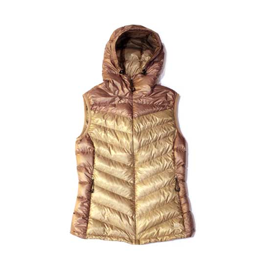 This is a ladies’ down vest featuring contrasting pink and purple colors. It is designed with a hood for extra protection. The quilted design ensures a good shape for a long time.