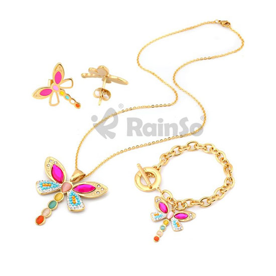 This jewelry set comes with a dragonfly design for a stylish touch. It is designed with a necklace, a bracelet and a pair of earrings. This jewelry set is crafted with opal stones and glass stones for an eye-catching look.