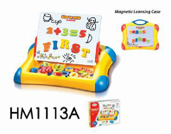 Magnetic Learning Case with 26 magnetic letters, 20 magnetic numbers, 6 magnetic symbols, 1 dry-erase board, 1 dry-erase marker, 2 board holders, 1 eraser