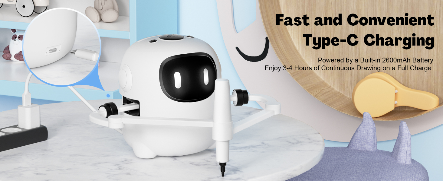 • 【Complete Set for Creative Fun】The Drawing Robot set includes everything your child needs to start creating: one Drawing Robot, 150 drawing cards, 12 colorful markers, 5 drawing pens, a reusable drawing board, and a Type-C charging cable.