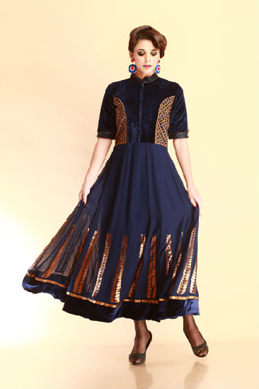 Blue georgette maxi dress with quilted velvet bodice and zari cutwork embroidery and antique gold foil print.