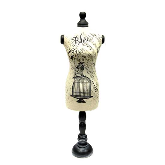 This dress form is made of linen and wood for sturdiness. It features patterns of music notes and a bird standing of a cage. This alluring dress form is widely used.