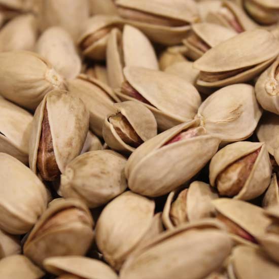 Showcased is a selection of dried pistachios with their shells half opened. The pistachios feature a crispy texture, with a mellow and aromatic flavor. The high nutritious content makes the nuts a healthy choice for snack.