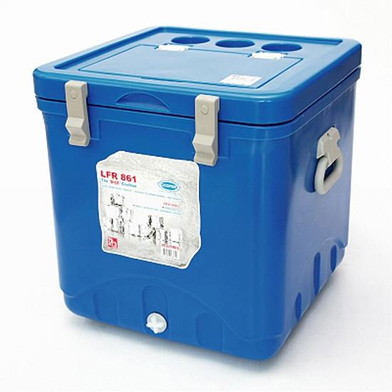 Showcasing here is a blue drink cooler with white handles and closure locks. The cooler is designed with a small lid and three hubs for holding drinks on the big lid. This cooler with the handles is easy to carry around which will be nice for a backyard or beach side picnic.