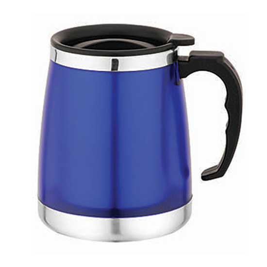 Displayed is a chubby drinking mug made with plastic and stainless steel for added durability. The ergonomic handle ensures a firm grip in hands. Customized logos or graphics can be made on the mug for promotional purposes.