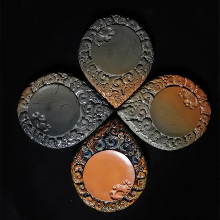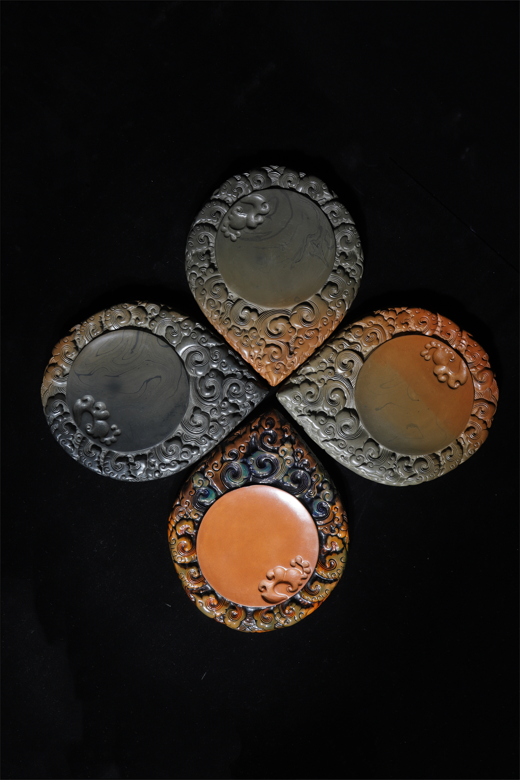 This inkstone is shaped like a water droplet, symbolizing that water can embrace all things. The concave area represents the ink pool, surrou by carvings of clouds and water merging together. The inkstone bed is circular, representing success and perfection. Seeing the big in the small, this tiny droplet embodies the Way o all things; it is infinitely small yet reveals the vast universe, and infinitely large as a single drop contains the ocean. Taking the water droplet as its form, it reveals profound philosophygh the small.