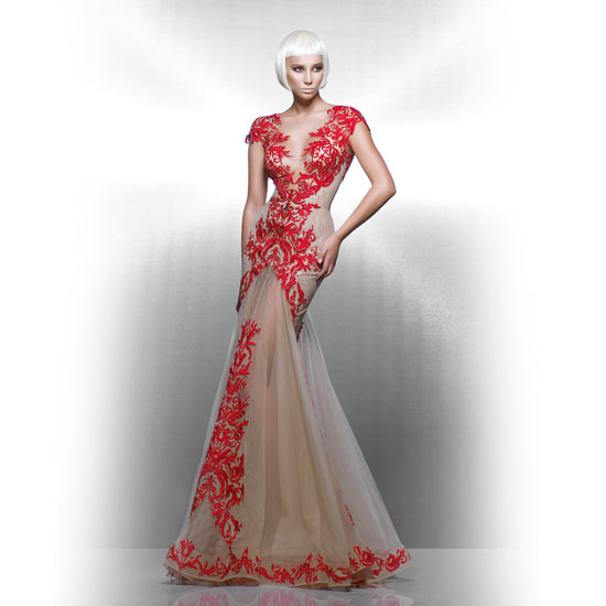 This is an evening dress with a unique, trendy and sexy design. It boasts a semi-transparent appearance and is highlighted with white red lace. The exquisite embroidered patterns add a touch of elegance to this dress.