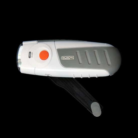 This dynamo flashlight comes in a compact design in white and light gray. It is fit with high-quality LEDs for bright and even illumination. The ergonomic handle allows a firm and comfy grip.