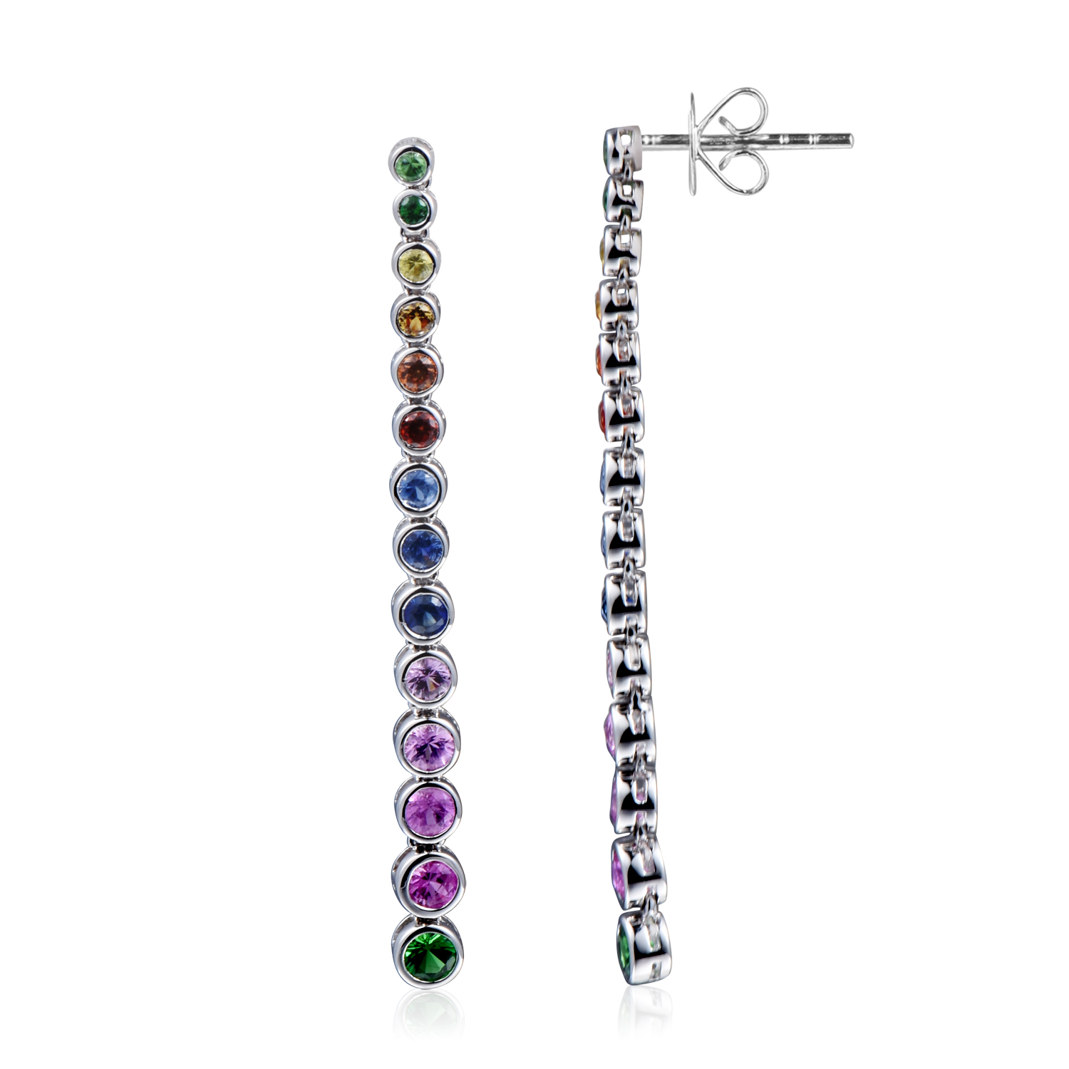 A pair of graduated earrings with rainbow sapphires, available in 14K & 18K.