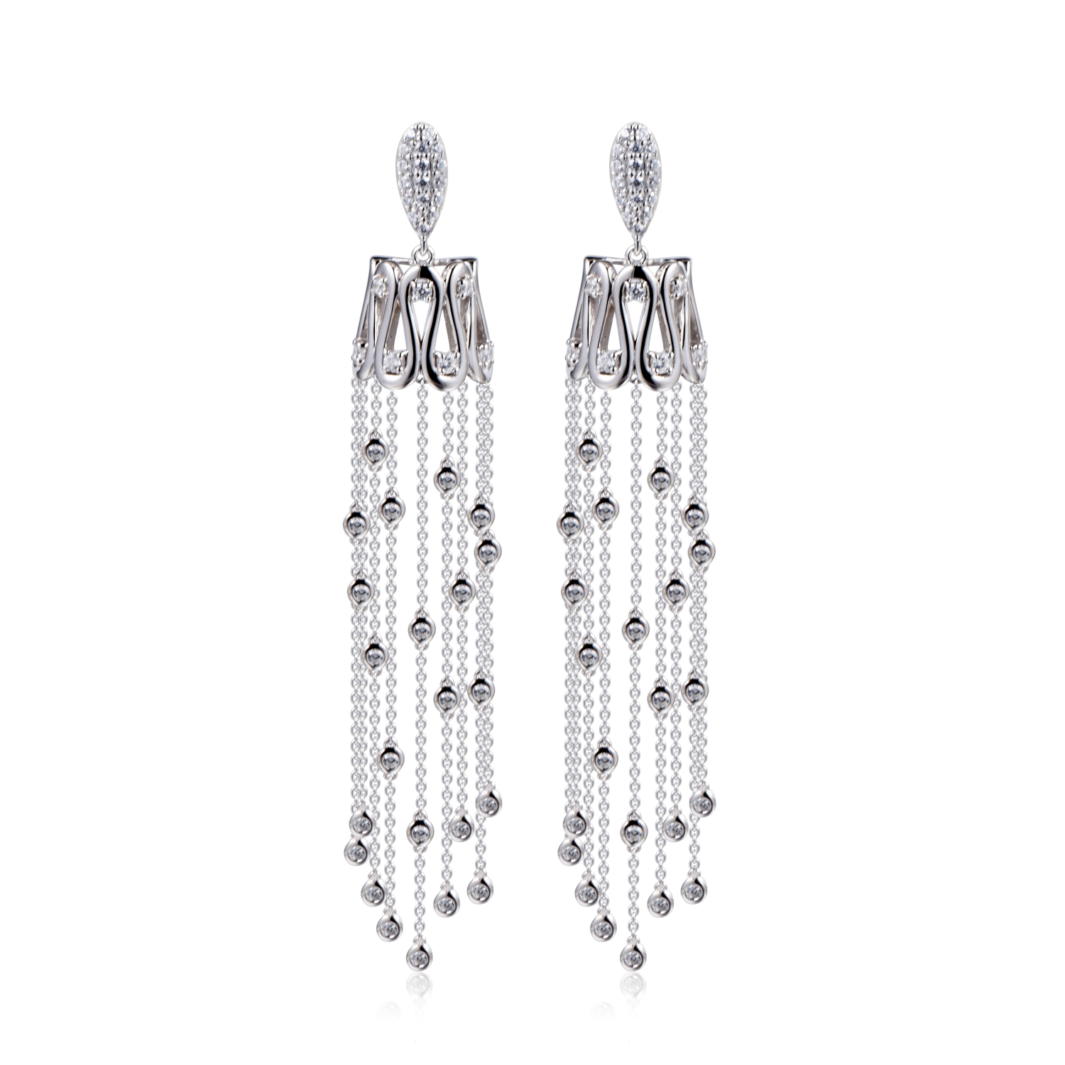 A pair of fascinating long earrings in waterfall design decorated with diamonds.