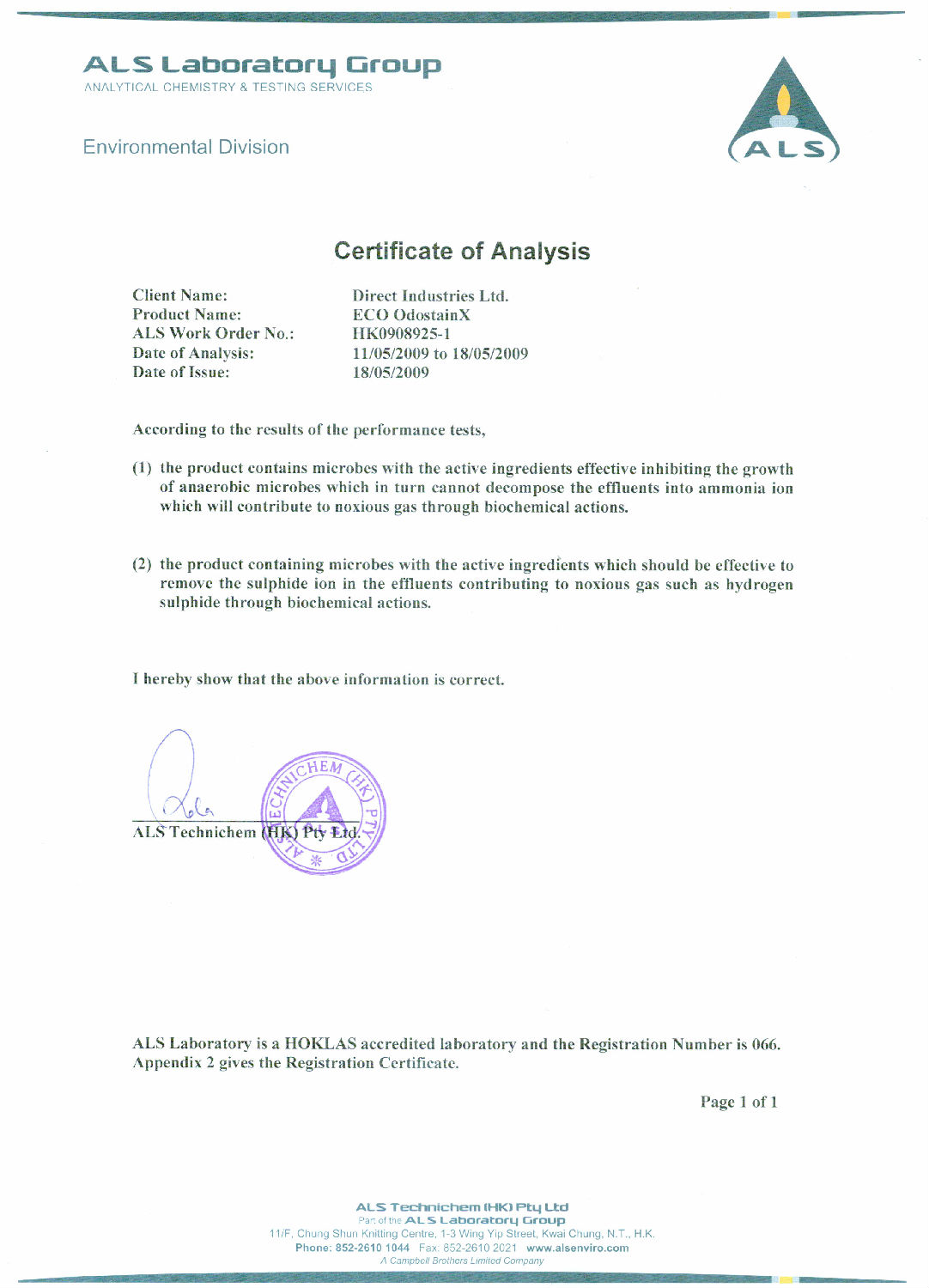 • Provides long-term odor control by removing the organics that cause odors and preventing the return of odor-causing compounds.