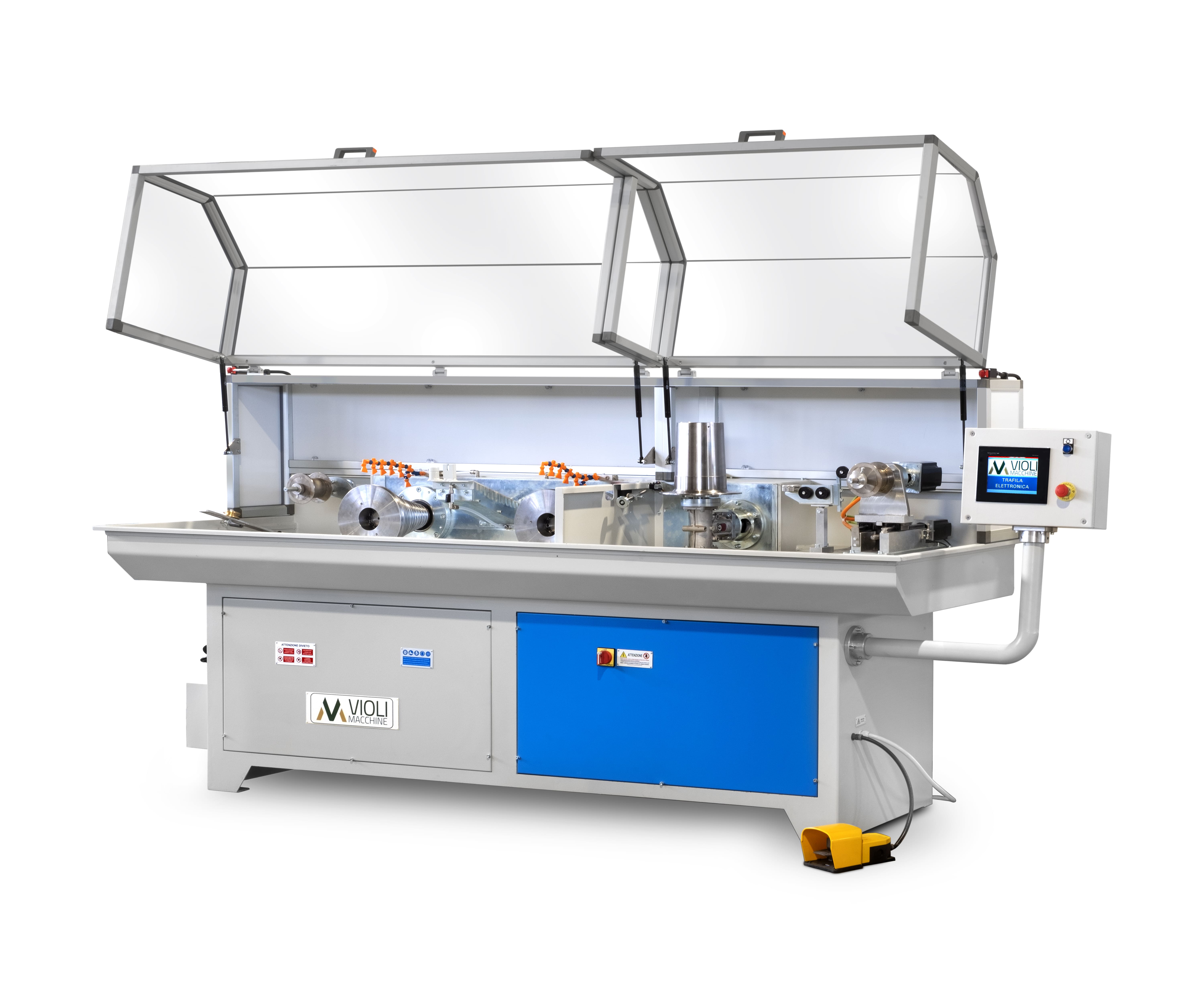 VM/12PE is an electronic 12- steps wire drawing machine designed to process wires having a diameter from 2 to 0,07 mm. The machine is able to work with a maximum speed of 300 m/min.