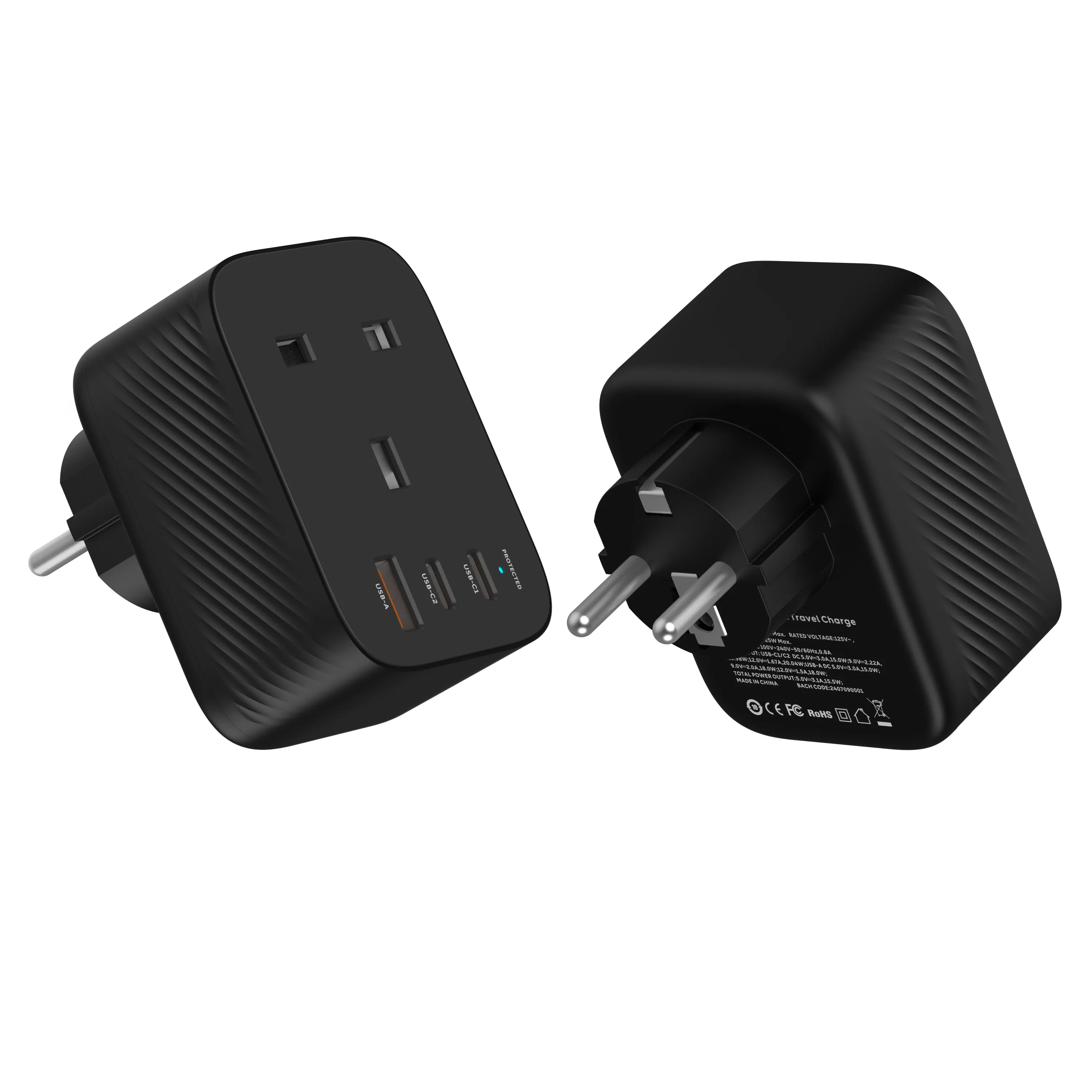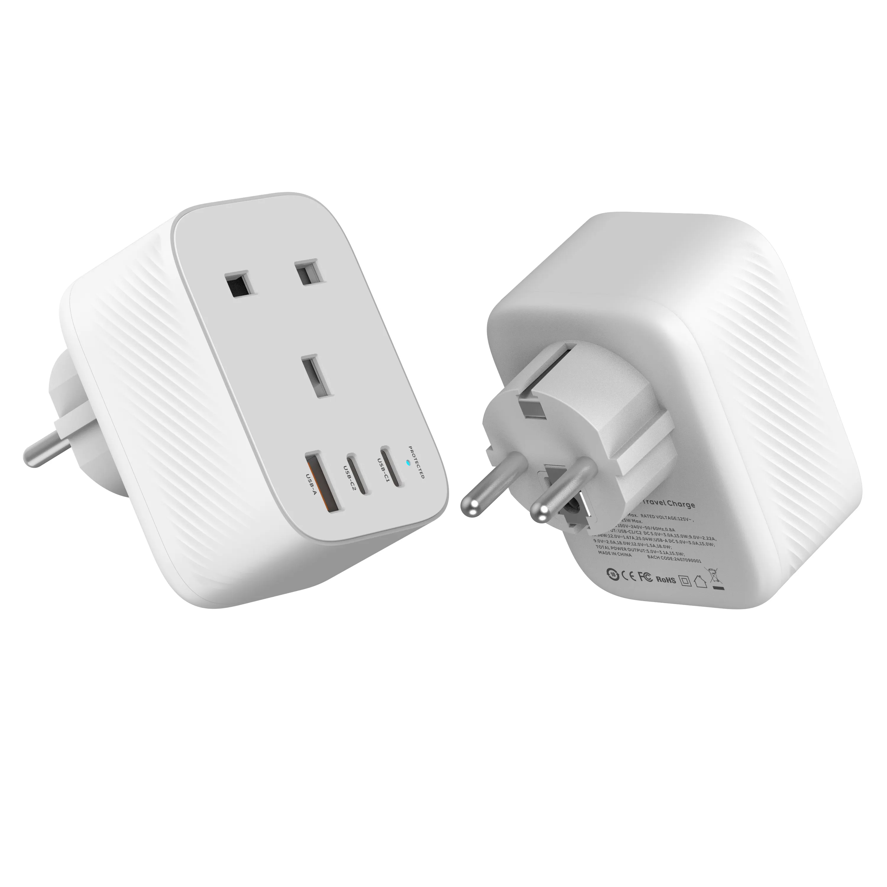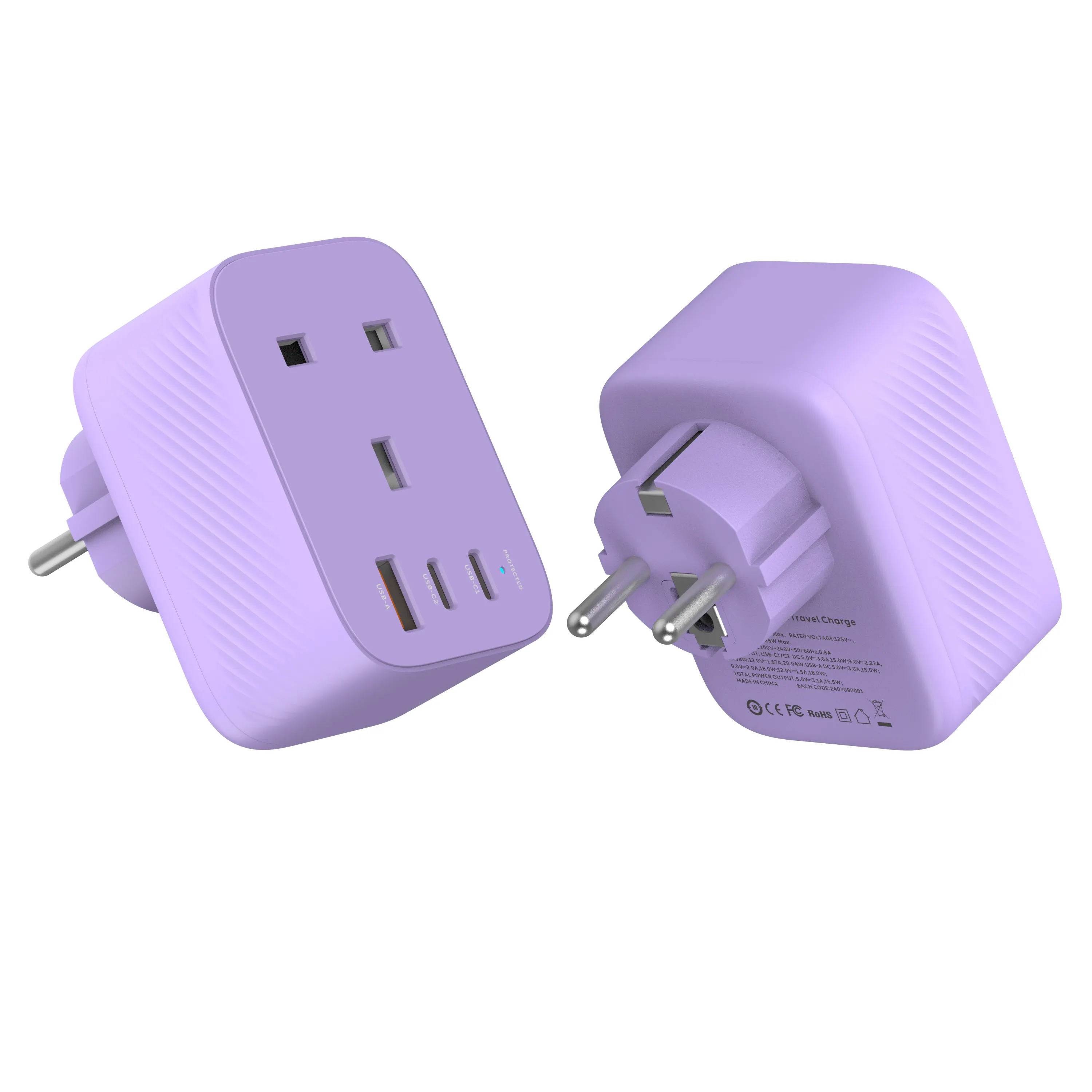 Travel plug adapter is a EU to UK mobile phone adapter that supports 20W fast charging, has one USB A output ports, and two USB Type-C ports. It comes in five colors, which are White, Purple, Blue, Green and Pink. PC 94V-0 FIREPROOF Material.Compact and portable, it is a good companion for travelers.
