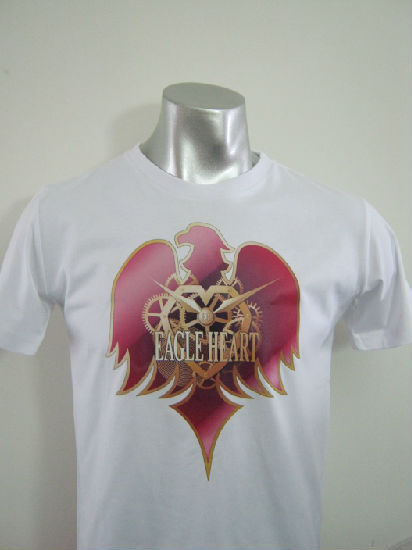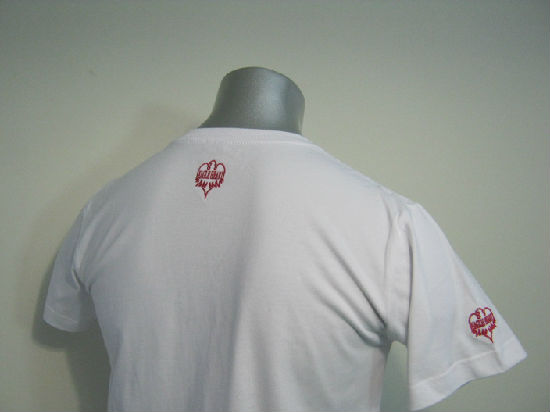 100% cotton round-neck white colour T-shirt, with clock design on the front, and 2 red embroidered emblems
