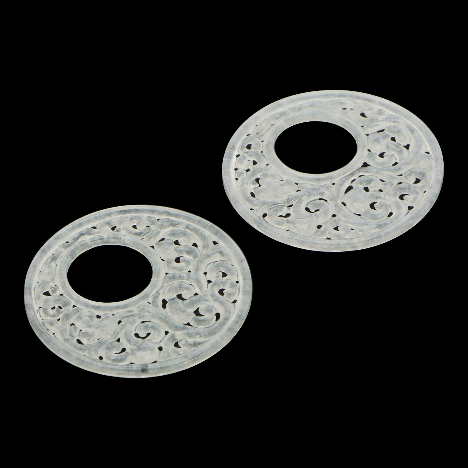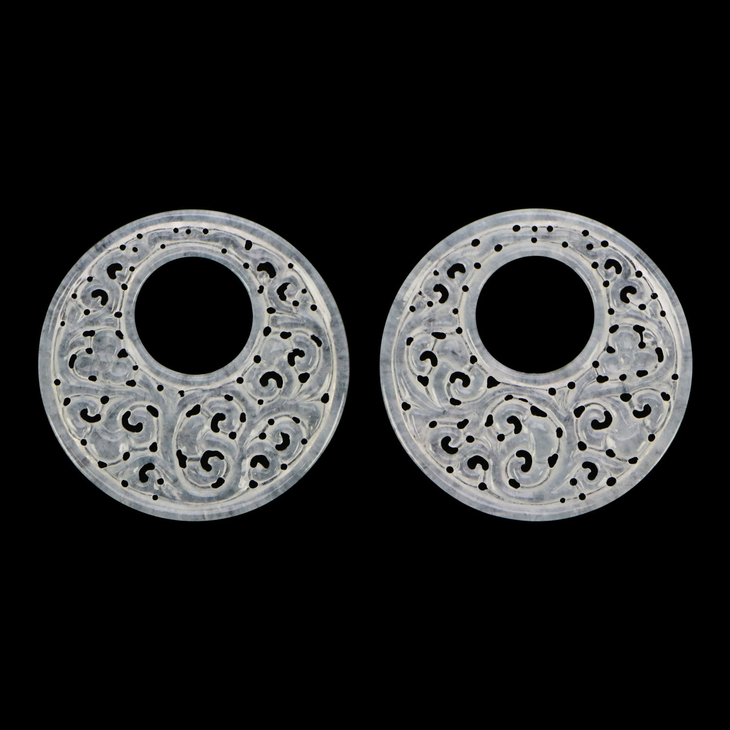 This earring comes in a round shape and is embellished with classy swirls patterns. It is handcrafted using natural type A white jadeite jade and has a round hole for attachment. The jadeite earring is excellent for completing an elegant look and is a great accessory for formal occasions.