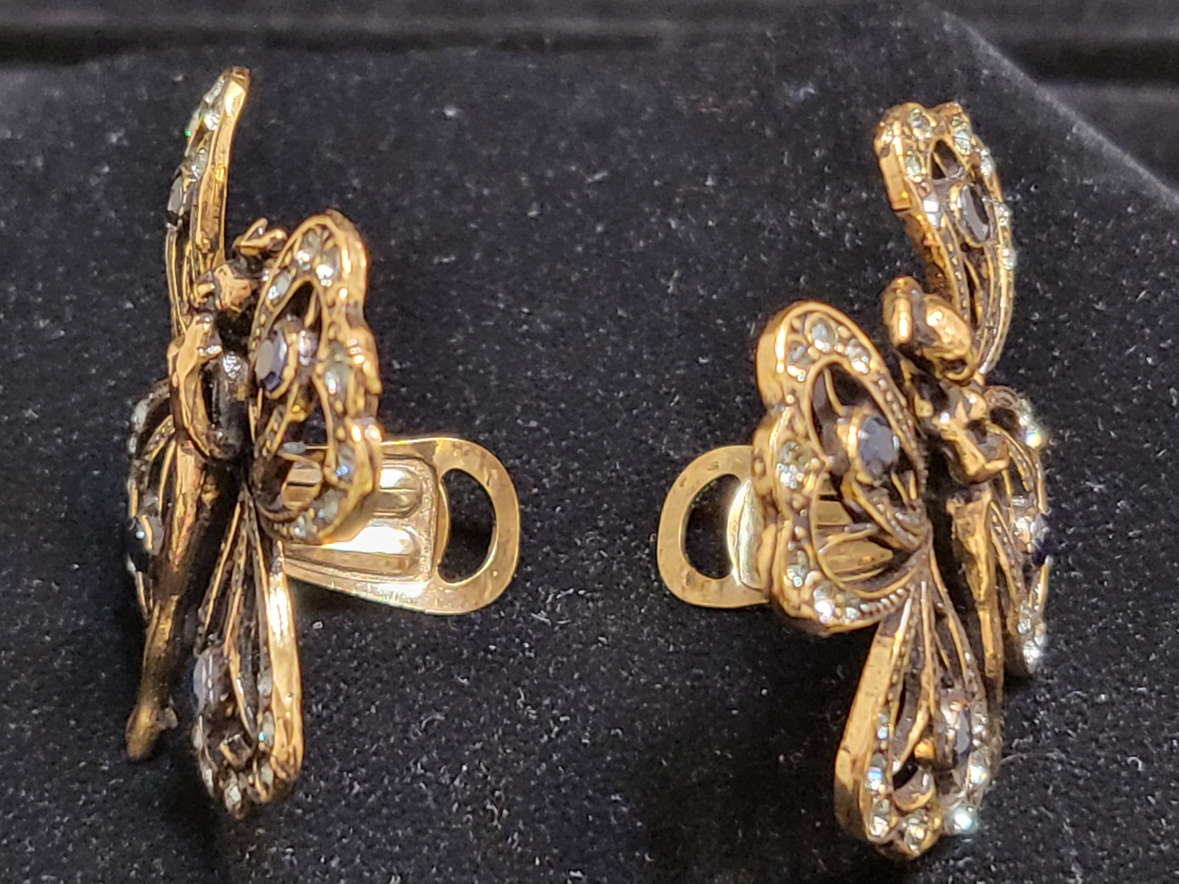 Clip earrings in golden brass with dancing fairies embellished with swarovski and sapphires. Select the finish, the hooking variant and the variant of precious to replace with sapphires.