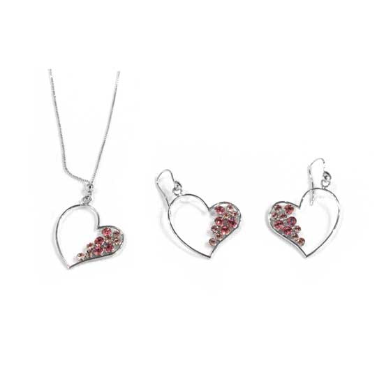 These earring and necklace set features an open heart design accented with pink Swarovski crystals. The jewelry pieces are finely crafted of sterling silver in a polished finish. The pretty heart jewelry set will add a lovely touch to your look.