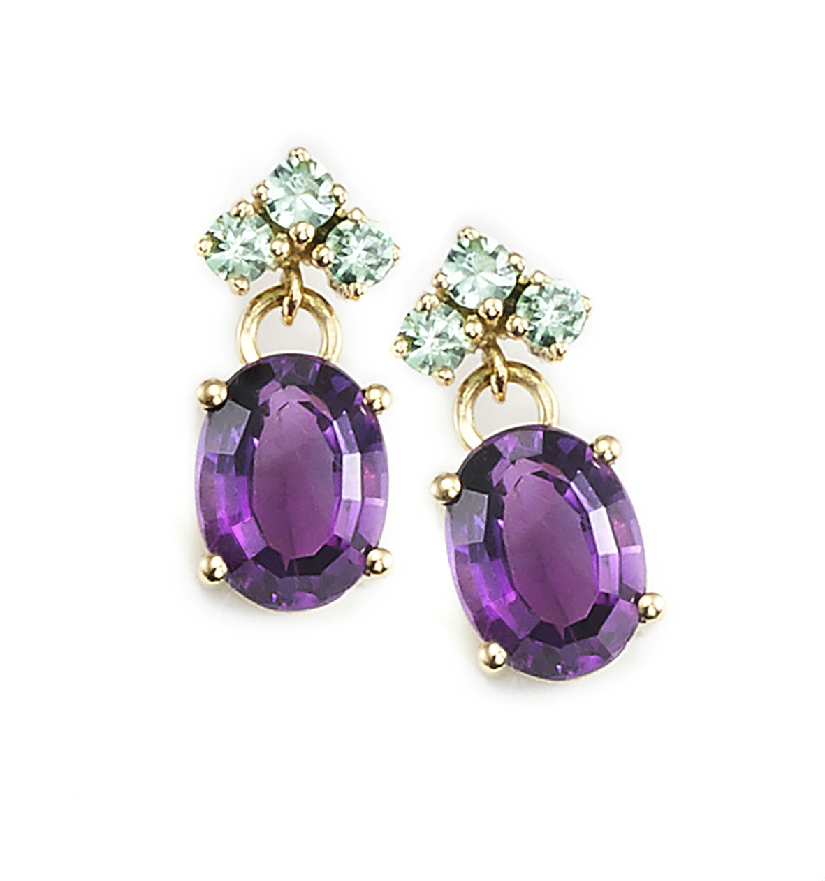 A wonderful pair of earrings in yellow Gold 18 ct with two amethyst 10x8mm and three Paraiba turmalines.
