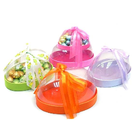These are packaging boxes with an oval shape. Each box contains a satin tray and a 0.55mm transparent PVC cover. There is a 1" matching color satin centered organza ribbon for closure.