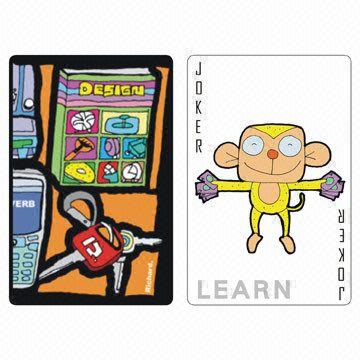 Displayed is a set of educational playing cards coming in amazing cartoon style. The artwork on these PVC poker cards features delightful vividly printed cartoon artwork. These educational playing cards has also assorted verb and vocabulary printed on them for child or kids to learn new English words.