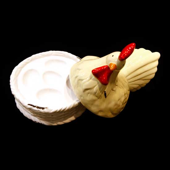 This storage container is used for storing eggs. This egg storage container is made of high-quality ceramic for added durability. It comes with a hen-head shaped cover for an attractive look.