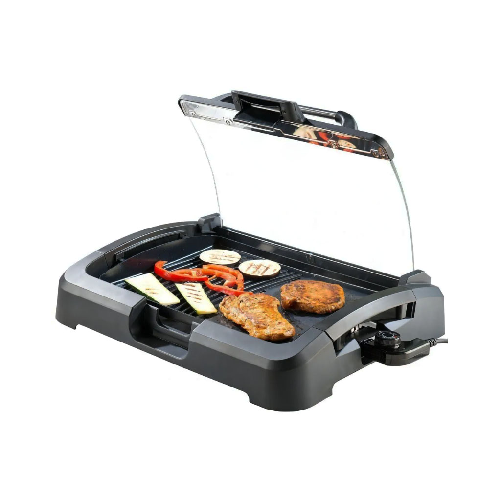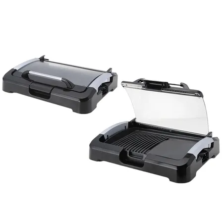 This electric table grill with grill plate and glass lid, without wood, no gas, plug into the can and off you go