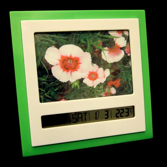 This electronic clock is fitted with a generous and presentable casing. It features a rectangular screen which displays the day, temperature, etc. The clock is also graced with comely floral imagery.