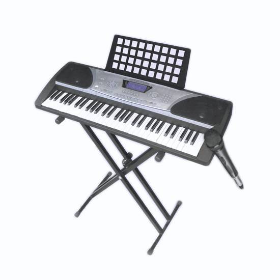 This electronic keyboard set comes with five octaves. It features a stable yet movable stand with an adjustable height for different needs. It also has two loud speakers and a microphone. With numerous functions, this keyboard makes an ideal entertaining item.