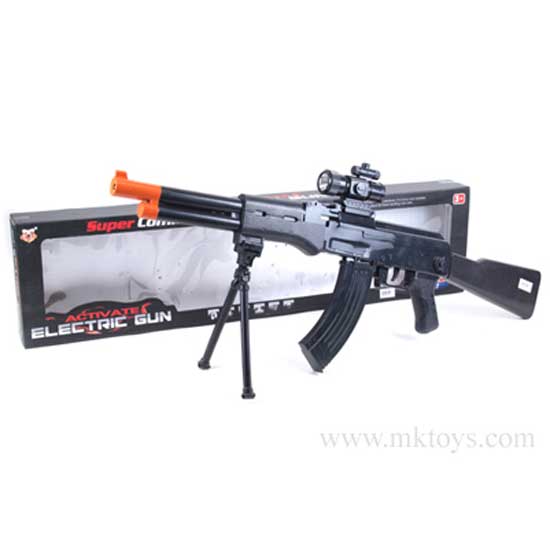 Presented to you is an electronic toy gun of sturdy construction. Meticulously designed, it can emit sound and light. This electronic toy gun is fun to play with.