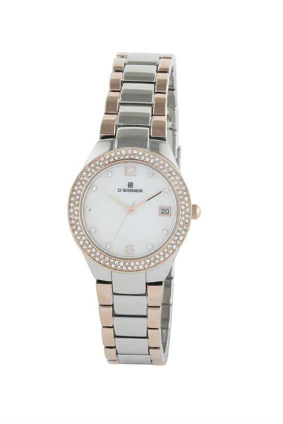 Featured here is a ladies watch with an elegant rose gold two toned design. It has a MOP dial with date feature and is embellished with gemstones on the bezel. This watch delivers reliable accuracy and is excellent for matching with all kinds of outfits.