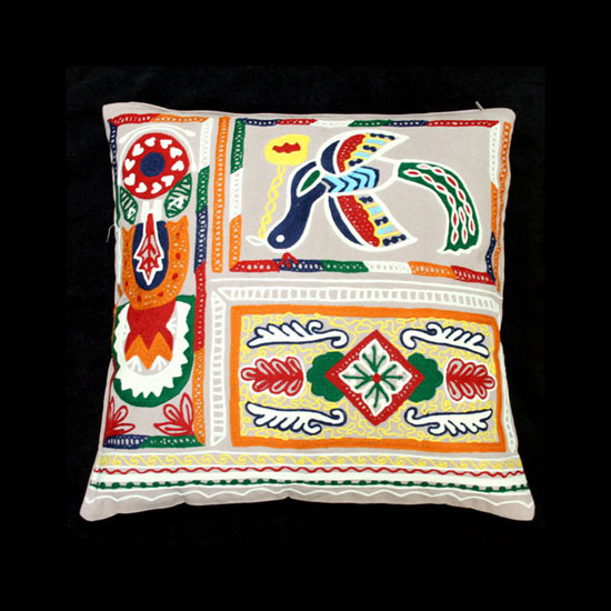 Featured here is an embroidered cushion accented with tribal patterns. The vivid finish gives an impressive touch. This embroidered cushion makes a chic addition to your sofa.