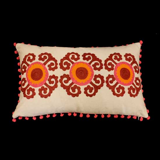 This embroidered cushion boasts a rich ethnic touch with bold patterns in warm hues. The playful design features bright pink ball ornaments along the rim. This comfortable, decorative cushion is an amazing addition to every household.