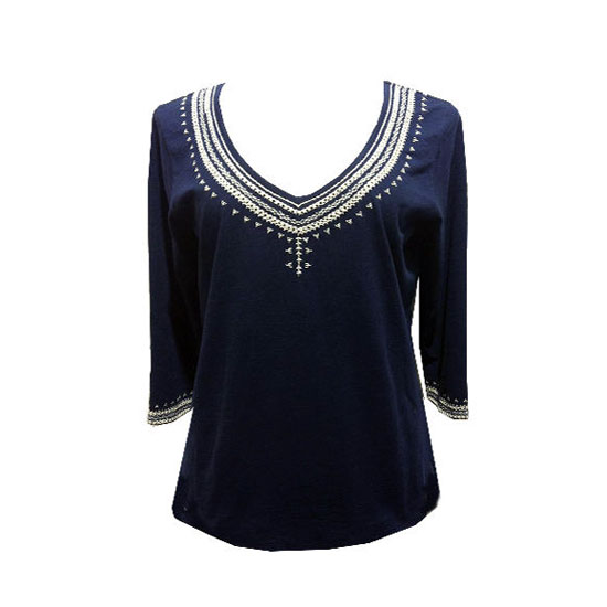 This embroidered ladies' T-shirt is graceful and stylish. The finely manufactured T-shirt delivers satisfying wearing comfort. It is a great addition to your fashionable wardrobe.