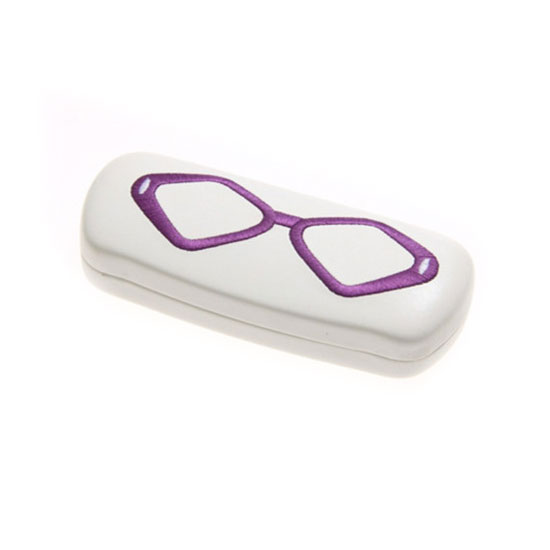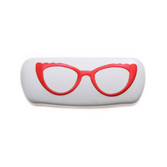 This is a white glasses case embroidered with a pair of fancy eyeglasses for a trendy touch. This glasses case is simple yet stylish to match your bag. This playful glasses case stands above traditional nerdy, old-school spectacle cases.