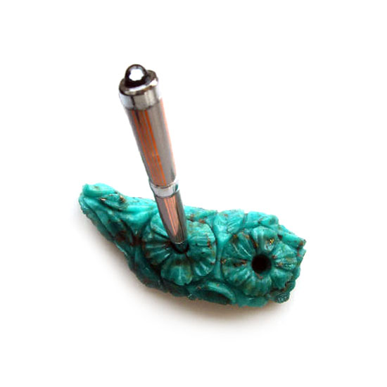 This is an emerald carving that is designed as a pen stand for added utility. It is finely crafted with refined details. This emerald carving is an ideal choice to add an artistic touch to any study room.