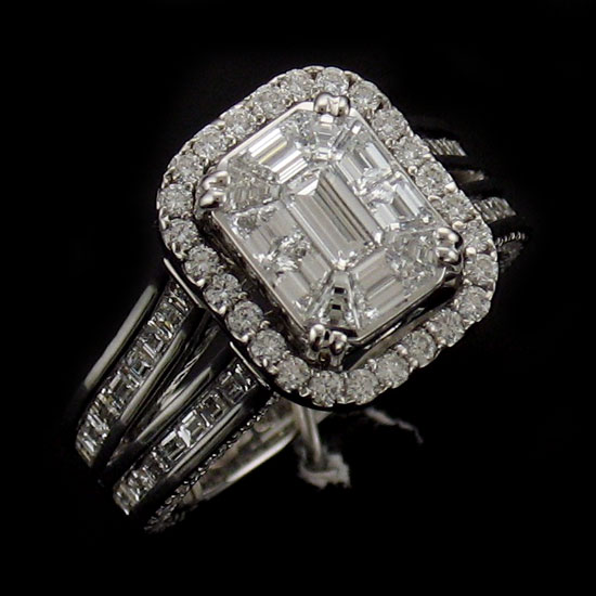 The finger ring is set with an emerald cut diamond on top. It is finished with excellent workmanship. This piece also features luxurious white gold construction.