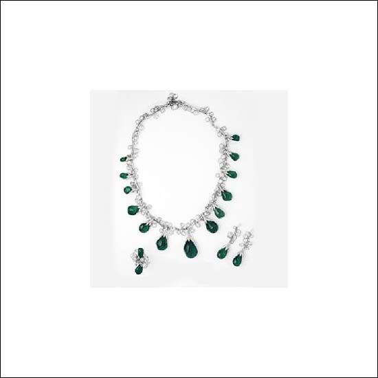 Platinum emerald drop and diamond necklace with matching ring and earrings