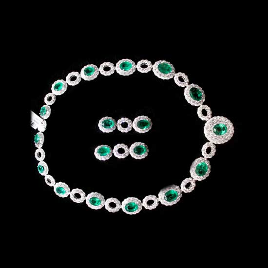 • Necklace: 18K white gold, 15.43cr RD diamond and 52.63cr OV emerald.