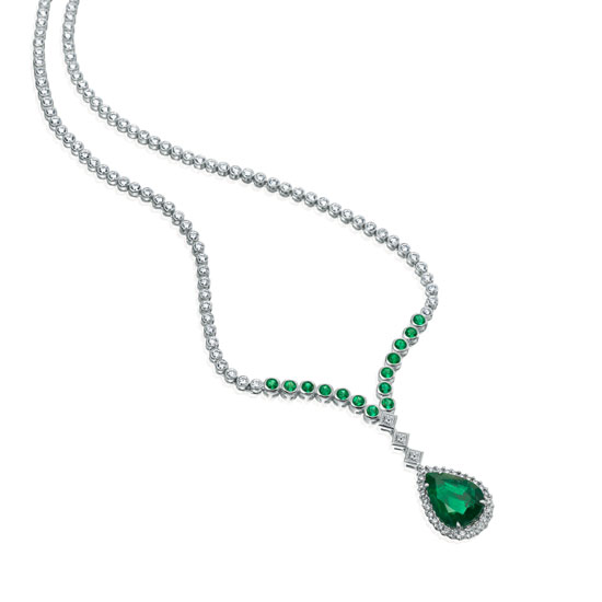 This is a dainty necklace with a noble and luxurious appearance. It is made of 18K white gold with a pear emerald pendant which is encircled with shimmering diamonds. The smaller emerald and diamond stones make this necklace look more charm and deluxe.