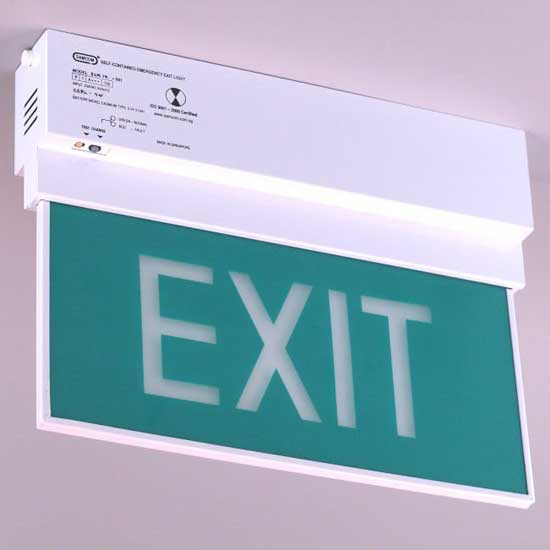 Displayed is an emergency light that is ceiling-mounted. It gives illumination with the fluorescent light source. The emergency light is also designed to utilize battery power fully and prevents frequent blackening of light. The compact and light design of this exit light also allows easy installations.