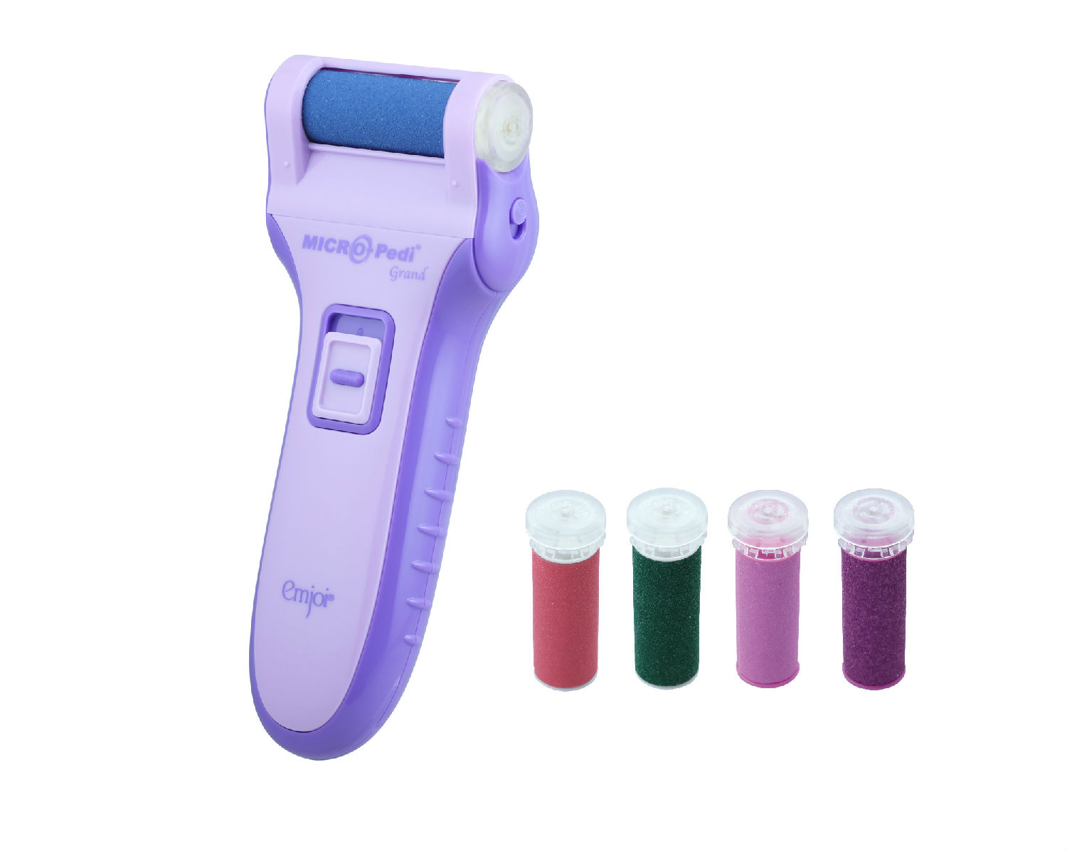Emjoi Micro-Pedi Grand is an innovative device create to smooth dry, rough and calloused skin on the feet. Unique, larger roller spins 360 degrees, at an amazing 30 times a second, to gently and effectively buff away hard, jagged skin on the soles and heels.