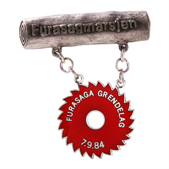 • Tree trunk design with a hanging chainsaw tipped disc.