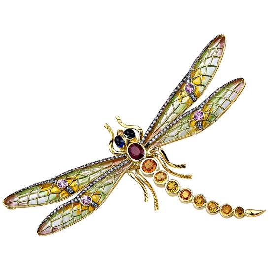 The featured item is an enamel brooch made of 18K gold. The brooch comes in a beautiful dragonfly design, where its head and body are pieced with a row of gemstones.