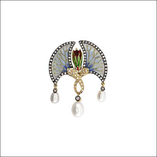 Art nouveau style brooch of 18K enamel diamond jewellery in the motif of two fans and a flower