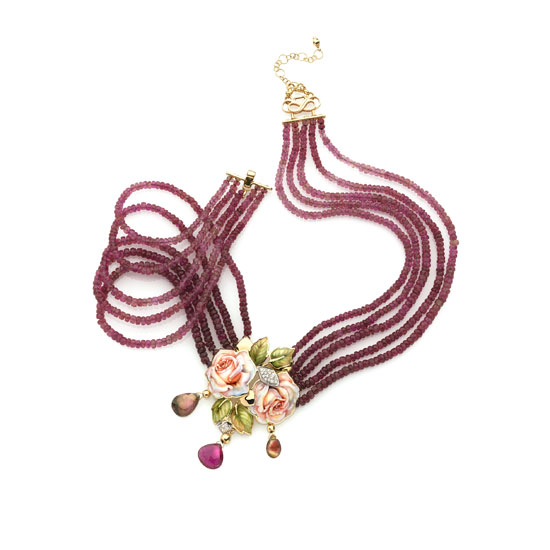 This artistic gold necklace features a multi-layered design for a unique look. It is embellished with 3 multi-colored, pear-shaped tourmalines. Add grace and charm to your evening outfit with this enamel gold necklace.