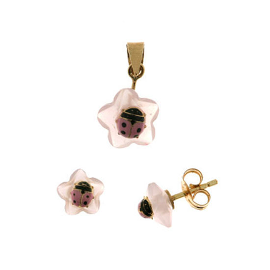 Displayed is an enamel ladybird set that comes in a lovely design. Featuring a ladybird made of yellow gold with enamel set on a quartz flower, this jewelry set is unique and adorable. With detailed craftsmanship, this enamel ladybird set is a choice of quality.