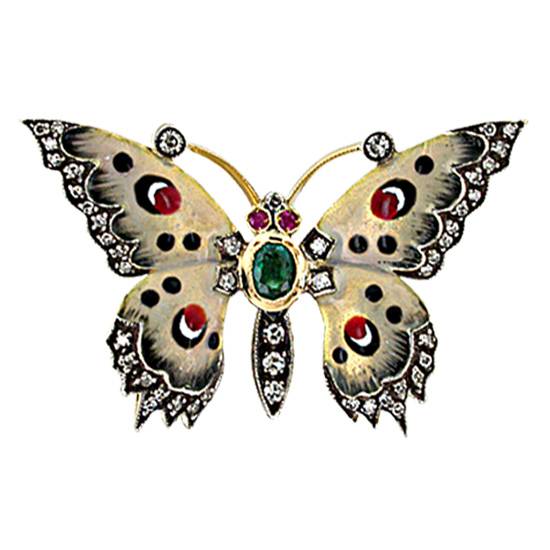 The featured item is an enamel pendant of 18K gold. The pendant comes in a magnificent butterfly design and decorated in diamonds, single emerald stone and rubies.