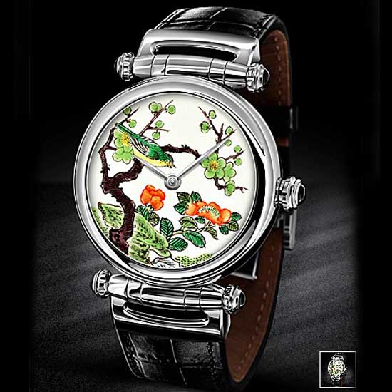 This men's enamel watch is characterized by a traditional, oriental design. A stylized painting of a bird resting on a tree is used on the white dial. The stainless steel watch case and leather watchband finish this fascinating timepiece elegantly.