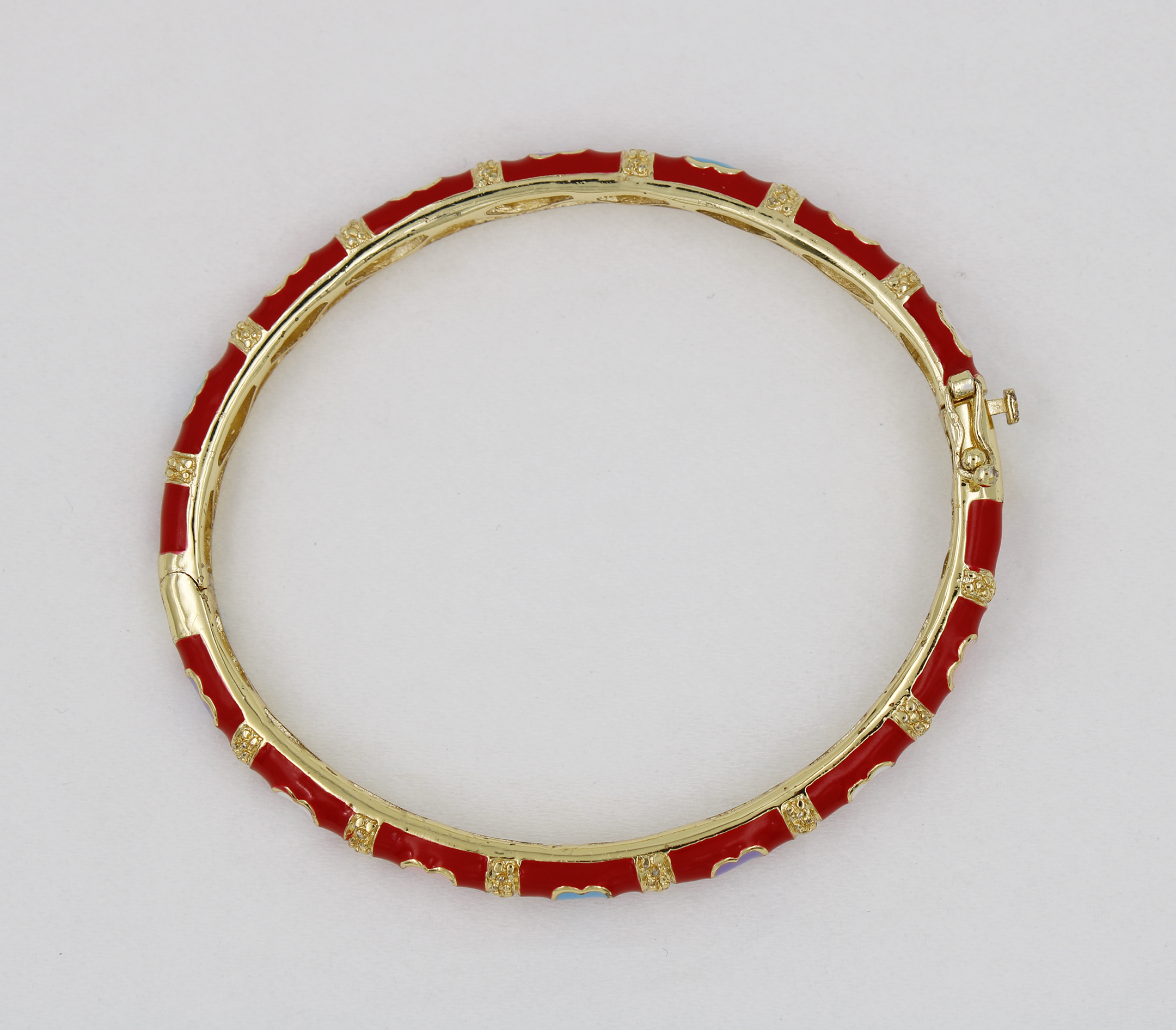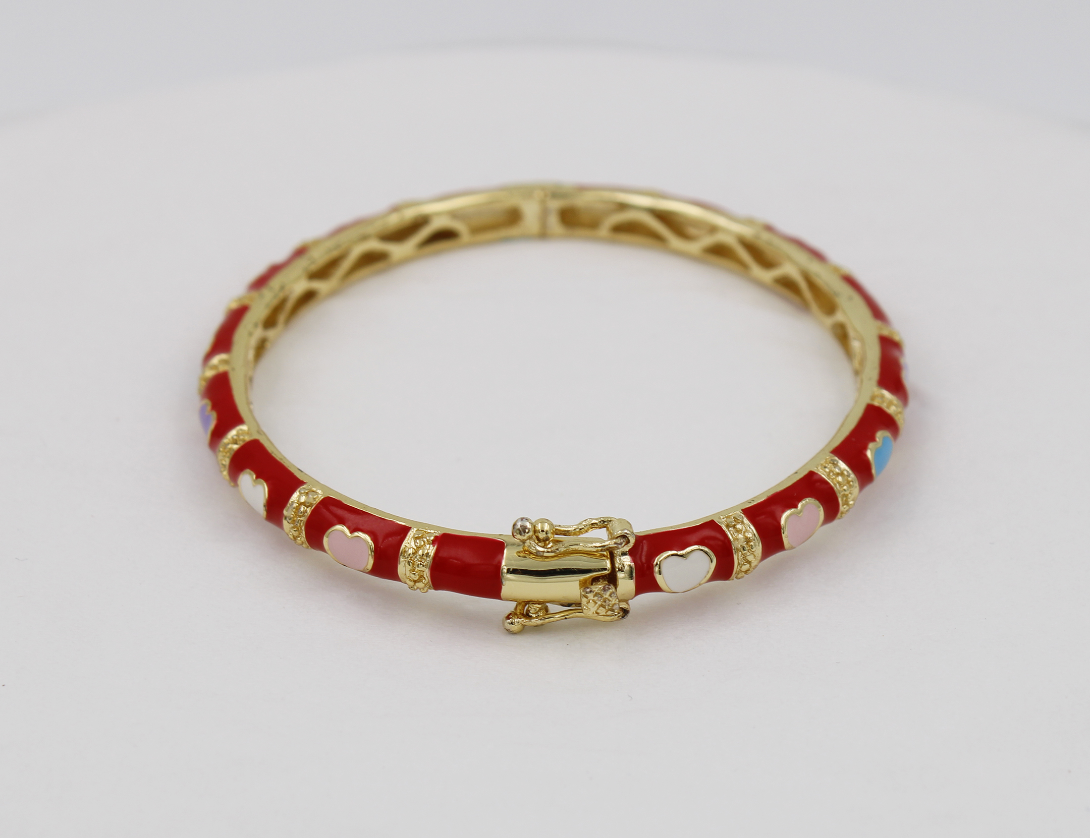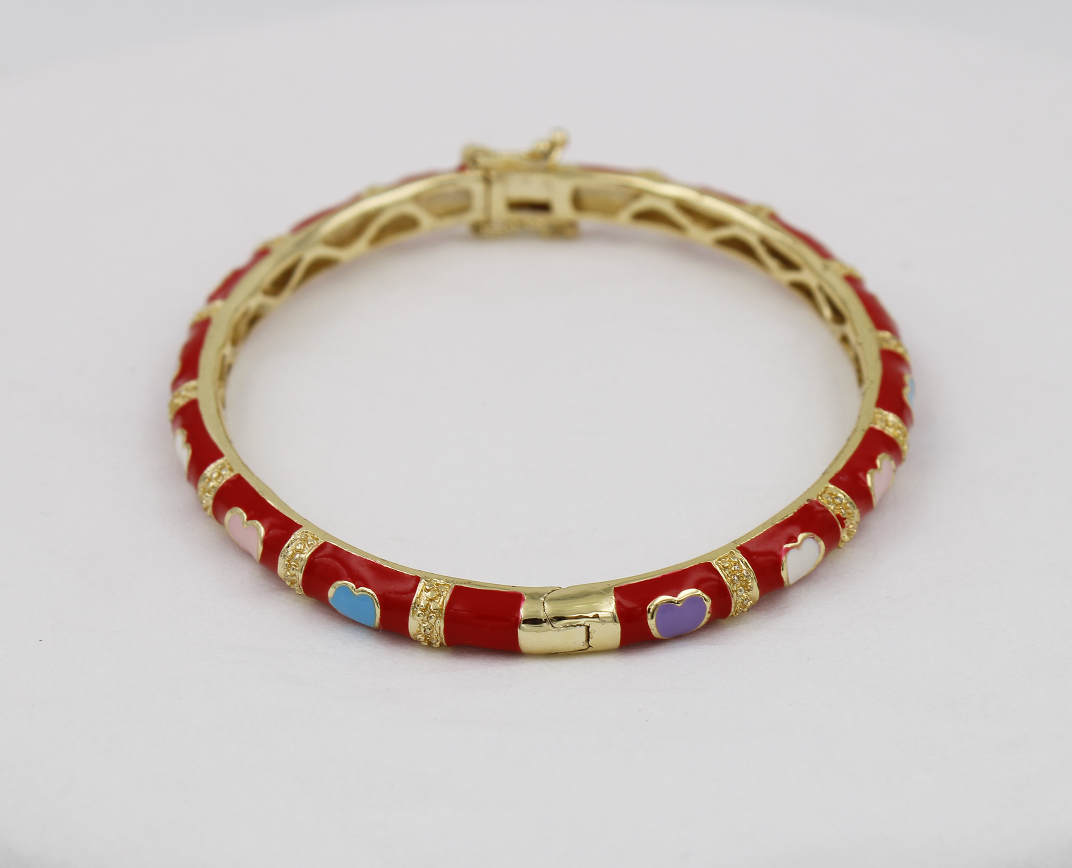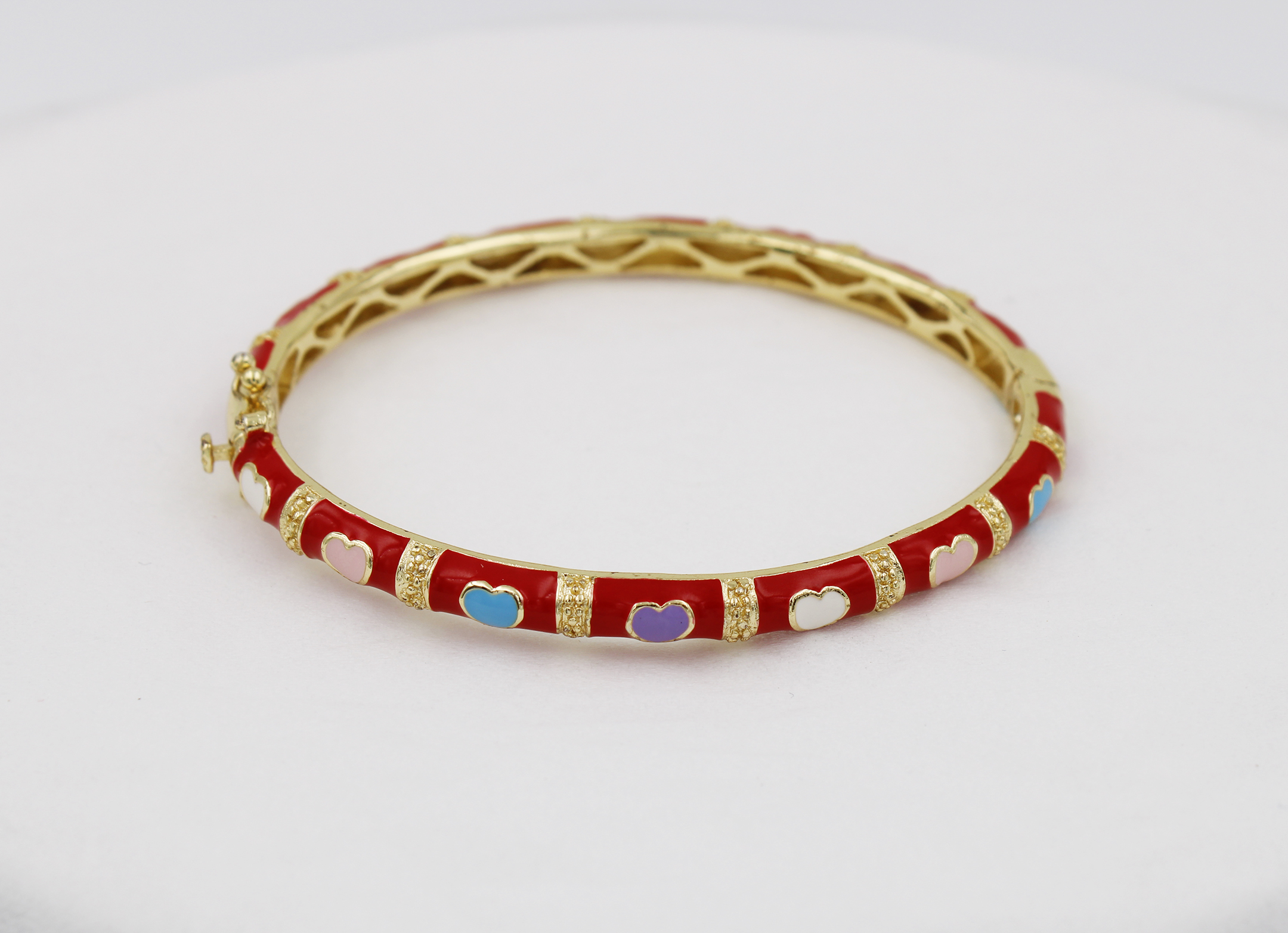 Brass bangle inner 57mm red color lay bangle with 14pcs heart , the heart frist pc of white, 2nd pc pink, 3rd of blue, 4th pc of purple, the 5th pcs repeat again, in 18K e-coat plated without nickel.