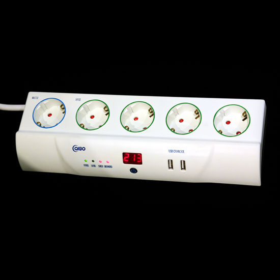 Pictured is a green-power energy saver with surge protection. The sliding safety cover helps to protect users and their children from electric shock while keeping dust and debris from unused outlets. The LED displays show easy-to-read voltage status.